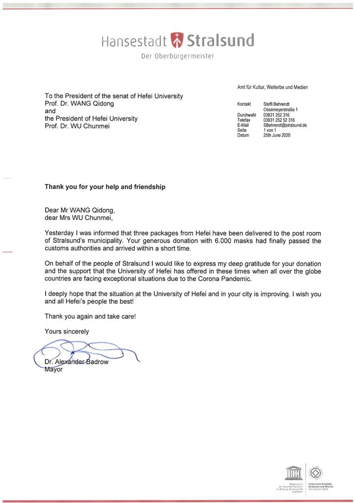 近日,德國施特拉爾松德市市長亞歷山大·巴德洛夫博士代表該市政府和市民致信我校黨委書記王其東和校長吳春梅,由衷感謝我校向該市捐贈6000只醫用口罩,并祝愿我校全校師生及全體合肥市民安康。