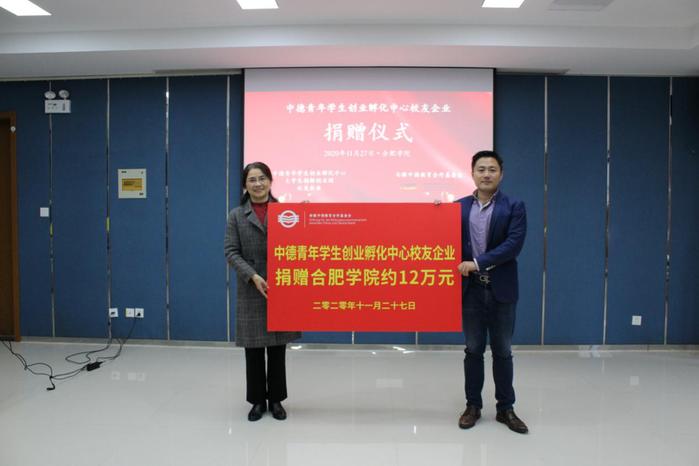 11月27日上午,我校舉行中德青年學生創業孵化中心(以下簡稱孵化中心)校友企業捐贈儀式,合肥學院副校長、安徽中德教育合作基金會(以下簡稱基金會)理事長陳秀出席。校計劃財務處處長、基金會秘書長何世昆,校孵化中心主任劉沛平和副主任孫虹,基金會管理辦公室副主任周舟以及孵化中心21家校友企業代表參加了捐贈儀式。儀式由基金會管理辦公室主任劉金平主持。