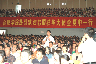 接著,金夏中大使來到禮堂,為我院近1500名師生作“攜手共創(chuàng)中韓關(guān)系美好未來”演講。金夏中大使在演講前幽默詼諧地解讀自己的名字說:“夏即華夏的夏,中即中國(guó)的中,說明我與中國(guó)很有緣分。”2002年,金夏中大使曾經(jīng)訪問過安徽,通過這次訪問,他覺得安徽的變化很大。他說,非常珍惜這次訪問機(jī)會(huì),安徽出了很多名人,韓國(guó)與安徽的交流處于起步階段,想多走走看看,多了解安徽,安徽為中國(guó)的改革開放作出過很多貢獻(xiàn),也反映了安徽人民的精神。他在演講中從韓國(guó)的經(jīng)濟(jì)發(fā)展,韓劇《大長(zhǎng)今》、《我的野蠻女友》等曾在中國(guó)流行的韓國(guó)電視劇談到韓國(guó)的飲食和電子、汽車工業(yè);從中國(guó)的滾滾“韓流”和韓國(guó)的陣陣“漢風(fēng)”談到韓中文化的交互融合;從他個(gè)人學(xué)習(xí)漢語和出任駐中國(guó)大使談到他與中國(guó)的不解之緣;從韓中的發(fā)展歷史談到中國(guó)國(guó)家主席胡錦濤訪問韓國(guó)時(shí)與韓國(guó)總統(tǒng)盧武鉉達(dá)成的共識(shí)“在政治上,中韓兩國(guó)應(yīng)該成為不同社會(huì)制度國(guó)家和平共處的典范。”