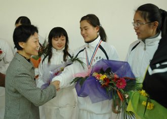 基礎教學部副主任許大慶首先就合肥學院擊劍隊組隊、訓練以及此次赴珠海參加第十一屆全國大學生擊劍錦標賽的情況作了介紹。接著,學生代表向運動員、教練員敬獻鮮花,張雪平副市長等領導還與擊劍健兒們進行合影留念。隨后,運動員、教練員代表分別發言;院長趙良慶發表了重要講話,他充分肯定了這是我院學生素質教育的一項重要成果。市體育局局長汪杰在講話中說,合肥學院擊劍隊白手起家,在這么短時間內,能在全國大學生擊劍錦標賽這樣的重大賽事中取得如此優異的成績是很罕見的,作為一位體育工作者打心眼里感到高興。