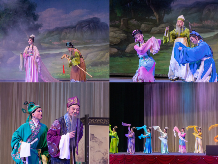 表演節目為黃梅戲經典劇目《天仙配》,共六場,分為《鵲橋》《賣身》《路遇》《上工》《織絹》《滿工》和《分別》。舞臺上“七仙女”唱腔悠揚,身段優美,演技精湛;“董永”表演真摯淳樸,生動傳神。兩個多小時的演出中,演員們將角色的內心世界展現得淋漓盡致,用婉轉悠揚的唱腔、生動傳神的表演將觀眾帶入一個充滿傳奇的戲曲世界,詮釋出了黃梅戲藝術的無窮魅力。整場演出極富地方韻味特色,充分展現了高雅藝術的獨特魅力。