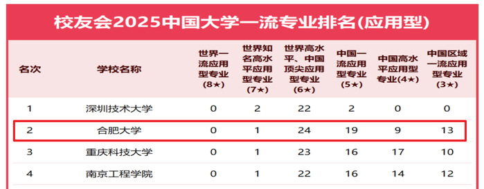 學(xué)校共有1個專業(yè)評為中國七星級專業(yè),24個專業(yè)評為中國六星級專業(yè),19個專業(yè)評為中國五星級專業(yè)。在2025中國大學(xué)專業(yè)分檔排名中,合肥大學(xué)19個專業(yè)評為A++,13個專業(yè)評為A+,15個專業(yè)評為A,各項(xiàng)指標(biāo)均位居全國同類高校前列。特別是生物工程專業(yè),憑借其強(qiáng)大的學(xué)科實(shí)力和專業(yè)建設(shè)成果,榮膺2025中國七星級應(yīng)用型專業(yè)。