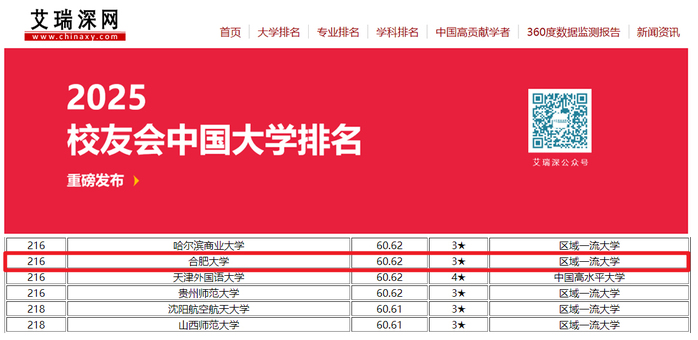 近日,全國第三方大學(xué)評價機(jī)構(gòu)艾瑞深校友會網(wǎng)發(fā)布《2025校友會中國大學(xué)排名》總榜,我校位列全國高校第216位,連續(xù)5年進(jìn)入榜單前300。