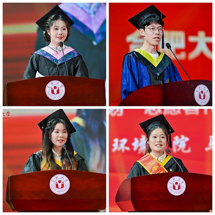 本科生畢業生代表朱茜茹、研究生畢業生代表李小凡、留學生畢業生代表蘇珍秋、“西部計劃”畢業生志愿者代表馬慧子、教師代表肖赟教授相繼發言。朱茜如表示將以校訓“厚德、博學、善思、致用”為精神動力,不負偉大時代,交上一份無愧于“合大人”的青春答卷。李小凡表示,將作為基層選調生積極把技術融入鄉村治理,把論文寫在祖國大地上。蘇珍秋感恩合大培養及“一帶一路”倡議帶來的機遇,立志成為中柬文化交流橋梁。馬慧子承諾扎根新疆基層,以“功成必定有我”的擔當投身西部建設。肖赟贈言畢業生“保持自信、學習、溫情”,以中科院院士逆境成長為例,勉勵做有溫度的時代青年。