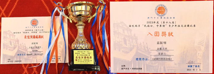 近日,由澳門辛亥?黃埔協(xié)進(jìn)會(huì)主辦的第十八屆海峽兩岸“民族心、中華情”青少年征文演講比賽在澳門舉行。我校語言文化與傳媒學(xué)院徐萌萌和吳若蘭代表安徽省大學(xué)生參加比賽,徐萌萌榮獲“最佳演講稿獎(jiǎng)”,吳若蘭榮獲“英才獎(jiǎng)”。