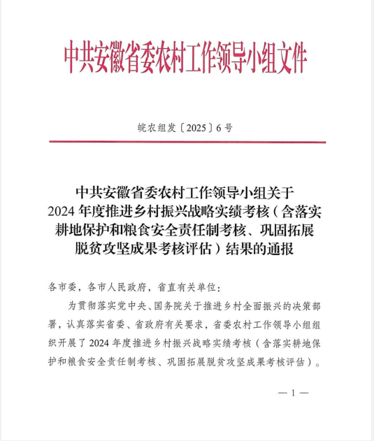 近日,中共安徽省委農村工作領導小組印發《關于2024年度推進鄉村振興戰略實績考核(含落實耕地保護和糧食安全責任制考核、鞏固拓展脫貧攻堅成果考核評估)結果的通報》(皖農組發〔2025〕6號),合肥大學定點幫扶泗縣工作被評定為“優秀”等次,這也是開展相關考核工作以來,我校連續第八次獲得此成績。