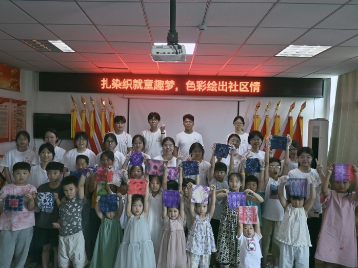 團(tuán)隊(duì)前往潁陽(yáng)社區(qū),開(kāi)展扎染知識(shí)講解活動(dòng)。活動(dòng)現(xiàn)場(chǎng),團(tuán)隊(duì)成員借助PPT與實(shí)物展示,向社區(qū)小朋友介紹扎染的歷史、工藝及技巧,并為每位小朋友發(fā)放扎染材料。在隊(duì)員們的指導(dǎo)下,小朋友們對(duì)白色布料進(jìn)行折疊、捆扎,再浸入染料中染色,最終呈現(xiàn)出各具特色的扎染作品。