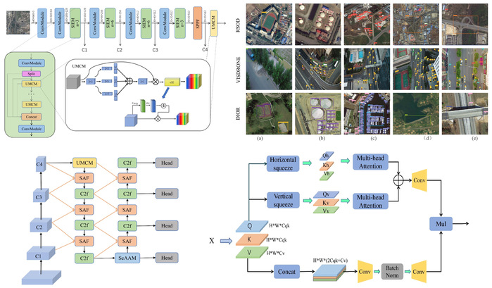在遙感小目標(biāo)檢測方向,團隊針對遙感影像復(fù)雜背景干擾和小目標(biāo)檢測難題,提出軸壓縮與多路徑尺度自適應(yīng)融合網(wǎng)絡(luò)(AMSFNet)。該網(wǎng)絡(luò)設(shè)計單向多尺度耦合模塊增強小目標(biāo)特征提取能力,構(gòu)建軸壓縮增強注意力模塊聚合全局與局部信息以降低背景噪聲干擾,通過多路徑尺度自適應(yīng)融合方法實現(xiàn)大小目標(biāo)檢測平衡。陳巖博士為第一作者,王曉峰教授為通訊作者,合肥大學(xué)人工智能與大數(shù)據(jù)學(xué)院為第一完成單位。(論文標(biāo)題:Axis-Squeeze and Multirouting Scale-Adaptive Fusion Network for Remote Sensing Images Object Detection,引用鏈接:https://ieeexplore.ieee.org/document/11121344)