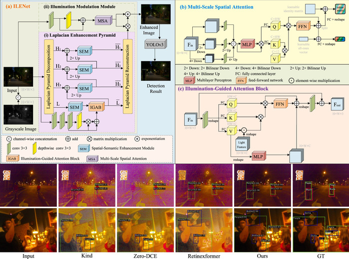 在低光環(huán)境目標(biāo)檢測方向,團隊提出光照調(diào)制拉普拉斯金字塔增強網(wǎng)絡(luò)(ILENet)。該網(wǎng)絡(luò)設(shè)計 LEP 與 IMM 兩大關(guān)鍵組件,LEP 優(yōu)化低光圖像多頻率信息以提亮度、IMM 生成語義校正參數(shù)以優(yōu)圖像,且與 YOLO 檢測器集成形成新框架,采用聯(lián)合訓(xùn)練平衡增強與檢測任務(wù),在低光數(shù)據(jù)集上達 SOTA(準(zhǔn)確率 78.5%),其有效性亦經(jīng)低光語義分割任務(wù)驗證。王曉峰教授為第一作者,鄒樂教授為通訊作者,合肥大學(xué)人工智能與大數(shù)據(jù)學(xué)院為第一完成單位。(論文標(biāo)題:ILENet: Illumination-Modulated Laplacian-Pyramid Enhancement Network for low-light object detection,引用鏈接:https://www.sciencedirect.com/science/article/pii/S0957417425001265)