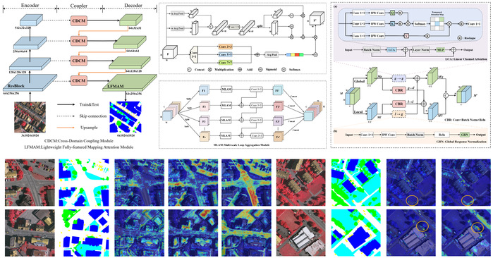 在復(fù)雜場景遙感語義分割方向,團隊提出輕量級跨域耦合網(wǎng)絡(luò)(LCCN)。該網(wǎng)絡(luò)創(chuàng)新性采用“Encoder-Coupler-Decoder”架構(gòu),耦合器中通過跨域耦合模塊實現(xiàn)多尺度特征提取與全局信息建模,解碼器中借助輕量級全特征映射注意力模塊捕捉多維度特征交互,優(yōu)化復(fù)雜場景下的語義分割效果。王曉峰教授為第一作者,陳巖博士為通訊作者,合肥大學(xué)人工智能與大數(shù)據(jù)學(xué)院為第一完成單位。(論文標(biāo)題:Cross-Domain Coupling Network With Lightweight Fully Featured Mapping and Loop Aggregation for Semantic Segmentation of High-Resolution Remote Sensing Images,引用鏈接:https://ieeexplore.ieee.org/document/11129080)