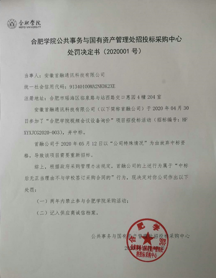 合肥學(xué)院視頻會(huì)議設(shè)備詢價(jià)項(xiàng)目(項(xiàng)目編號:HFXYXJCG2020-003)于2020年4月30日開標(biāo),中標(biāo)供應(yīng)商為安徽首融通訊科技有限公司(以下簡稱首融公司),該公司于2020年5月12日向我校投遞棄標(biāo)函,根據(jù)學(xué)院相關(guān)規(guī)定,該項(xiàng)目作流標(biāo)處理。