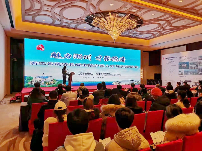 推介會上,黃建豐從歷史地理、文化優勢、產業優勢等方面簡要介紹了德清縣的基本情況。蔣斌從實習就業、安家落戶、創新創業等方面詳細介紹了大學生來德清就業創業的政策待遇和發展前景等等。