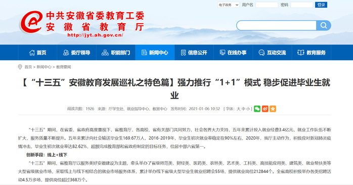 近期,省教育廳官網推出“十三五”安徽教育發展巡禮報道之特色篇《強力推行“1+1”模式 穩步促進畢業生就業》,報道中多次提及我校的就業創業工作措施和成效。