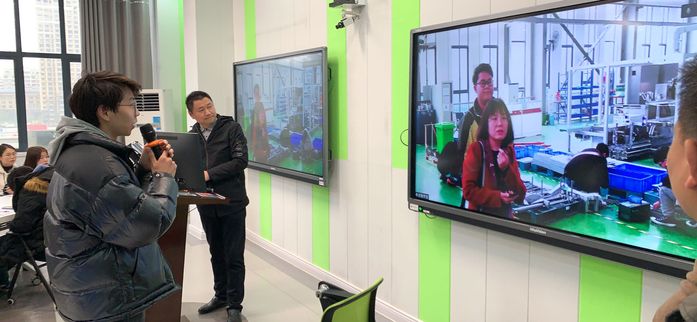 活動(dòng)期間,教務(wù)處孔春華老師在現(xiàn)場協(xié)調(diào)兩地直播進(jìn)度及模式切換,教務(wù)處徐厚昌老師、先進(jìn)制造工程學(xué)院馮敏亮老師分別在學(xué)校現(xiàn)場、企業(yè)現(xiàn)場擔(dān)任直播主持。學(xué)校活動(dòng)現(xiàn)場設(shè)在合肥學(xué)院多媒體智慧教室35棟305室,共有42名機(jī)械電子工程、機(jī)械設(shè)計(jì)制造及其自動(dòng)化等相關(guān)專業(yè)學(xué)生參加,多位老師在場協(xié)調(diào)安排;企業(yè)活動(dòng)現(xiàn)場設(shè)在哈工大機(jī)器人(合肥)研究院、合肥哈工龍延智能裝備有限公司等地,部分實(shí)習(xí)學(xué)生、指導(dǎo)老師、企業(yè)導(dǎo)師等在現(xiàn)場,通過專業(yè)攝像設(shè)備進(jìn)行實(shí)況直播。網(wǎng)絡(luò)媒介將學(xué)?,F(xiàn)場與企業(yè)現(xiàn)場連接,形成實(shí)時(shí)互動(dòng),達(dá)到線上線下混合式實(shí)時(shí)結(jié)合。