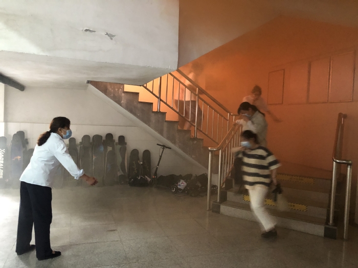 演練前,易班中心等網絡媒體面向全校推送防災減災知識,各學院輔導員向學生普及了防震及消防疏散應知應會知識。演練指揮組、通訊聯絡組、疏散引導組、應急保障組、宣傳報道組等通力協作,確保場地及各項物資準備到位。過程中,各組合作確保了演練安全有序進行。在現場疏散引導員的提醒指引下,學生們在防震演練階段能找到安全可靠地點進行躲避并做好身體重要部位的安全防護,在消防疏散演練階段能護住口鼻并保持低姿快速通過濃煙區。