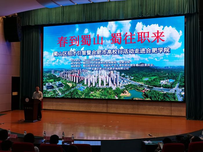 5月14日下午,由合肥市蜀山區人民政府主辦,蜀山區人社局和合肥學院承辦的“春到蜀山、蜀往職來”蜀山區招才引智暨合肥市高校行(合肥學院站)活動在我校圖書館學術報告廳A廳舉行。合肥市大中專畢業生就業指導中心主任楊永哲,蜀山區委常委、常務副區長劉智,蜀山區人力資源和社會保障局副局長楊軍、團區委副書記趙曉云、經濟開發區社會事務局局長朱江,我校黨委委員、學生處處長朱濤,各二級學院黨委副書記、學工辦負責人、就業聯絡員、畢業班輔導員和部分學生代表參加活動。