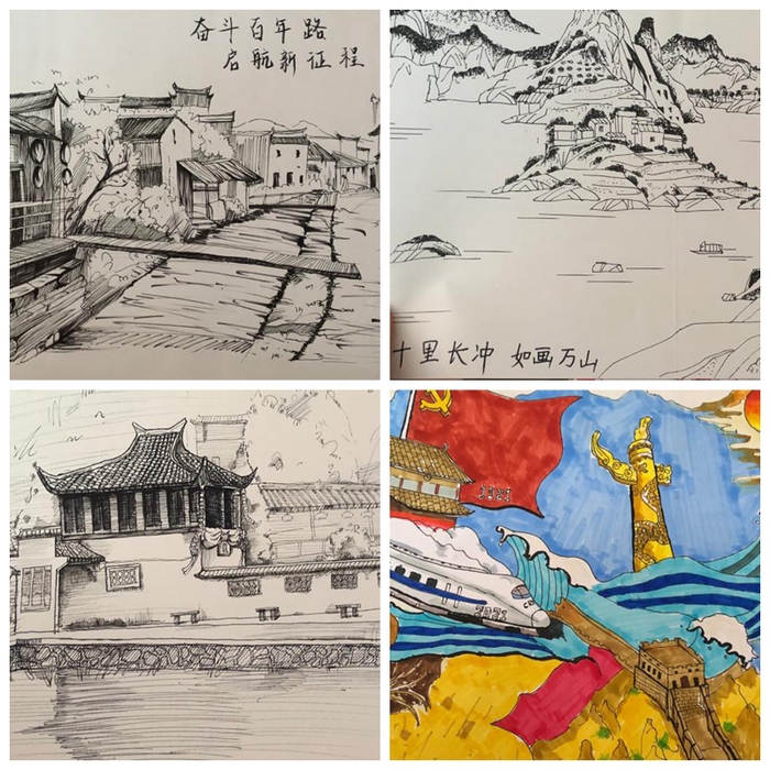 在完成金絲皇菊的包裝設(shè)計和周邊文創(chuàng)產(chǎn)品設(shè)計后,團隊成員還舉辦了主題為“禮贊建黨百年,書畫美麗鄉(xiāng)村”的慶祝建黨100周年書畫和手工作品展。同學們緊扣“農(nóng)業(yè)、農(nóng)村、農(nóng)民”主題,突出建黨100年來我國農(nóng)村翻天覆地的變化?;顒又校蠹覝蕚淞烁魇礁鳂拥墓ぞ?,如超輕粘土、卡紙、膠水等等,充分發(fā)揮專業(yè)特長,在三天時間內(nèi)完成了繪畫、書法、手工作品共60余件,準備近期在萬山鎮(zhèn)文化館展出。