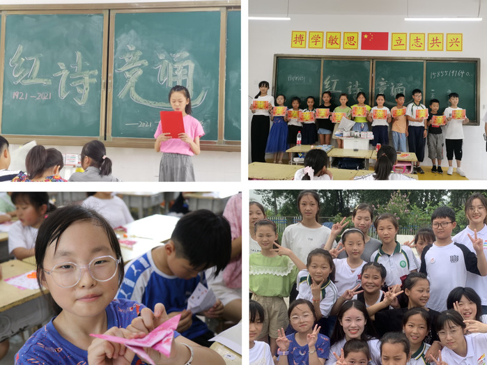 “大哥哥大姐姐們給我們講課,帶我們做游戲,讓我們學(xué)到了好多知識(shí)。我一定要努力讀書(shū),爭(zhēng)取上大學(xué)。”六年級(jí)學(xué)生張思穎興奮地說(shuō)。在為期7天的實(shí)踐活動(dòng)中,愛(ài)心支教組走進(jìn)鄉(xiāng)村為當(dāng)?shù)貎和_(kāi)設(shè)藝術(shù)文化課、黨史文化課、紅歌音樂(lè)課、巧手繪畫(huà)課等,向小朋友們講授各類(lèi)知識(shí),點(diǎn)燃他們渴望成才的夢(mèng)想。課程結(jié)束后,支教組隊(duì)員吳狄感慨道:“希望孩子們能夠養(yǎng)成熱愛(ài)學(xué)習(xí)、自覺(jué)學(xué)習(xí)的好習(xí)慣,從小就熱愛(ài)祖國(guó),心懷理想,成長(zhǎng)為一個(gè)有愛(ài)、有夢(mèng)想、全面發(fā)展的人。”隊(duì)員們不單單在課堂上認(rèn)真授課,課下還抓住一切時(shí)間與孩子交流互動(dòng),走進(jìn)他們的成長(zhǎng)環(huán)境,通過(guò)心靈的交織搭起溝通的橋梁,努力在孩子們的心里播撒下希望的種子。