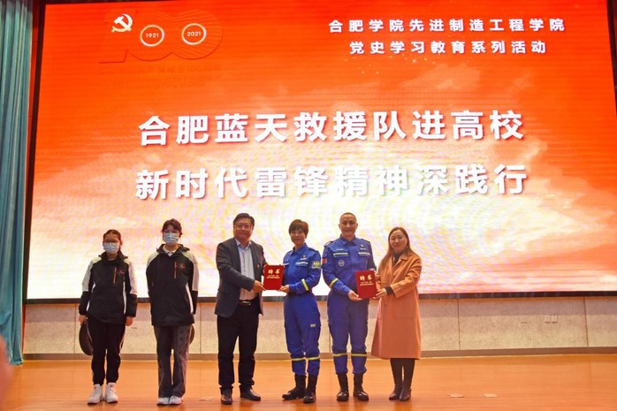 為進一步學習貫徹十九屆六中全會精神,扎實推進黨史學習教育,12月6日下午,我校先進制造工程學院聯合合肥市藍天救援隊開展 “合肥藍天救援隊進高校 新時代雷鋒精神深踐行”大學生主題思政教育講座。校黨委委員、宣傳統戰部部長賈峰,先進制造工程學院黨委書記杜娟、團委副書記鐘倫鎖、研究生黨支部書記沈丹丹,合肥市藍天救援隊黨支部書記劉曉冬、隊長蘇琴,合肥太古可口可樂飲料有限公司黨總支書記夏敏、工會主席李煜晨以及三家單位優秀黨員代表共同參加本次活動,講座由先進制造工程學院機制學生黨支部書記威力旺主持。