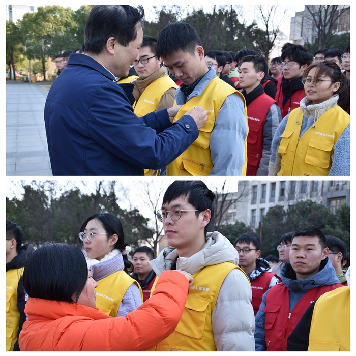 活動中,在場老黨員重溫入黨誓詞、新黨員進行入黨宣誓,由學院黨委副書記、院長呂剛領誓。凜冽寒風中,大家面向黨旗莊嚴宣誓,錚錚誓言,振聾發聵,表達了黨員們為共產主義事業奮斗終身的堅定決心。宣誓結束后,學院黨委委員分別為各學生支部新發展學生黨員代表佩戴黨徽,各位老師現場勉勵新黨員們在思想上行動上更加嚴格自我要求,積極向老黨員學習,以實際行動踐行入黨誓詞,不斷提高思想覺悟,做一名優秀的共產黨員。