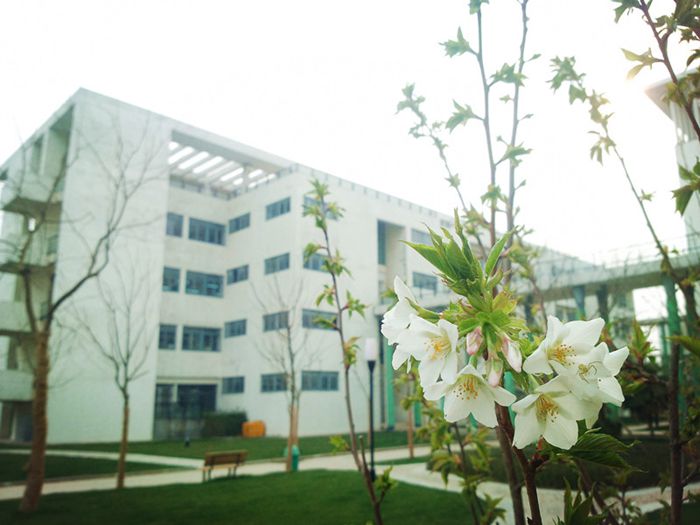 走入一區(qū)校園,銀杏枝頭的雀兒便歡歌相迎。恐人不知春消息,一曲迎春與君聽。兩旁高枝任它們追逐相嬉,一跳一躍間便譜出樂章無限。令人一見就恨不得身添雙翼,也化作一只鳥兒,飛上枝頭去看那初生的新芽,為它歌一首生的贊歌!由杏樹指路,鳥雀相引,讓人在滿目風(fēng)光中忘了腳下已走過了幾步路。繞過行知樓,映入眼中的,是一湖春水平如鑒,九曲小橋蜿如龍。你看那三三兩兩結(jié)伴同游的學(xué)生們,輕移蓮步,怕驚了碧水;慢吐鼻息,恐散卻游魚。柳絮紛紛,點(diǎn)在湖邊青苔;亭閣隱隱,映入水中綠樹。幾位留學(xué)生也趁著煦日暖陽,在這頗具中國古風(fēng)的小亭中談笑風(fēng)生。石橋分水色,照影團(tuán)圓中。水色隨春變,入畫意無窮。藝術(shù)樓的琴音與歌聲隨風(fēng)飄來,舞動(dòng)了垂柳,陶醉了櫻花,喚醒了羽衣甘藍(lán)。誰不愛這春動(dòng)校園,一片盎然?