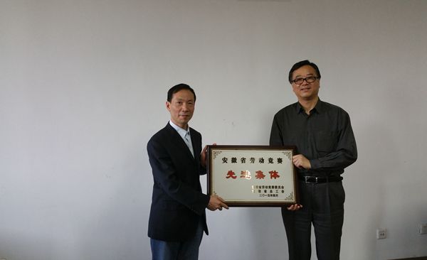 5月12日下午,合肥市總工會副主席戴建軍,經濟技術部部長孟衛民,文教工會主席顏慧珍等來我校頒授 “安徽省勞動競賽先進集體”牌匾,并為我校“勞模(職工)創新工作室”揭牌。校黨委書記蔡敬民會見了市總工會領導。副書記丁明,工會主席崔國慶等在行政樓四樓會議室熱情接待了來賓。