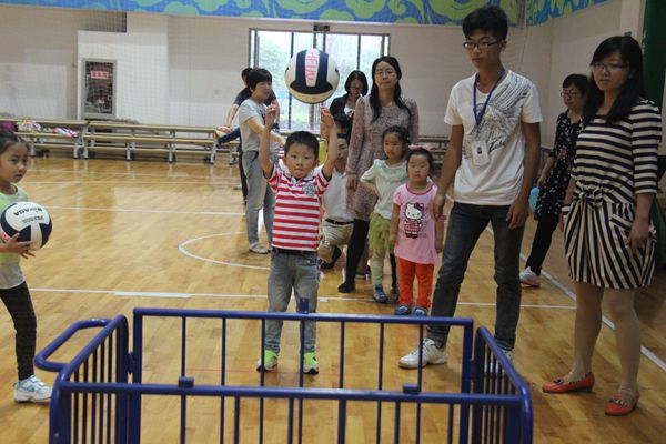 孩子們參觀校園過后,就到了本次活動最精彩的游戲環(huán)節(jié)。此次親子活動按照不同年齡段的兒童進行分組游戲,區(qū)分不同的游戲內(nèi)容。第一組由1-2歲的兒童組成,游戲為“爬爬樂”,孩子匍匐在軟墊子上,一步一步爬向終點。在游戲過程中,父母們的不斷鼓勵使得孩子完成了比賽。第二組由3歲的兒童組成,游戲為“袋鼠跑”,小朋友必須緊緊抱著家長的脖子,首先跑完全程的隊伍獲勝,考驗家長與孩子的默契度。第三組由4-6歲的兒童組成,游戲包括“三人兩足”、“定點投球”。游戲中,孩子們充分展示著童真的快樂,在互動中加深孩子與家長的情感。第四組由7-16歲的小朋友組成,游戲包括“運球”、“定點投籃”。孩子們精彩的表現(xiàn)和父母們洋溢在臉上的喜悅相映成趣,歡呼聲此起彼伏。在這次的比賽中,孩子們都獲得了由學(xué)校提供的榮譽證書和精美的禮物,