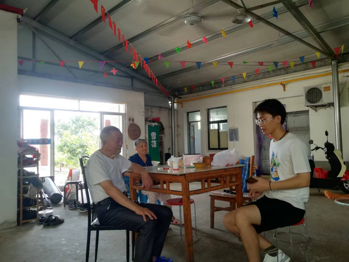 圖為陳鑫同學(xué)在采訪金寨縣大灣村村民陳澤申