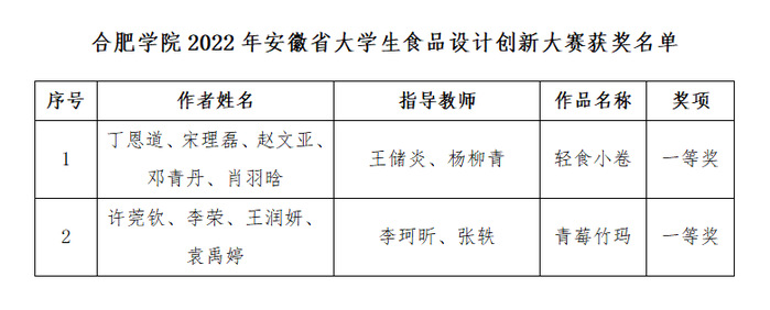 12 月 11 日,“皖酒·華東生物”杯安徽省大學生食品設計創新大賽決賽在蚌埠舉辦。我校推選的作品《輕食小卷》《青莓竹瑪》獲一等獎,我校獲優秀組織獎。