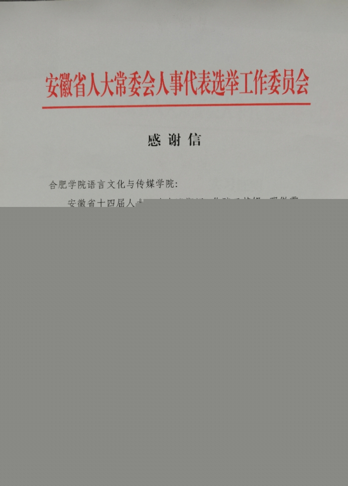 1月11日至17日,我校語言文化與傳媒學院的衛夢妮、鄧傲雪、王蕊三位同學圓滿完成安徽省第十四屆人民代表大會一次會議的實習任務,受到省人大領導的高度評價,并向我校發來感謝信。