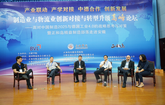 高峰論壇活動(dòng)豐富緊湊,上午組織代表實(shí)地考察參觀了德國馬牌輪胎(合肥)公司、合肥中鼎信息科技股份有限公司、蘇寧電器配送中心、中外運(yùn)合肥物流有限公司4家知名企業(yè);中午參觀了“合肥學(xué)院中德合作30周年成果展”。下午的論壇會(huì)第一階段分別是中國物流采購聯(lián)合會(huì)副會(huì)長蔡進(jìn)、共生物流平臺(tái)CEO盧立新、正和島副總裁王昆鵬、正和島精益制造部落酋長王洪艷等4個(gè)主題報(bào)告。隨后,論壇邀請了合肥學(xué)院黨委副書記丁明、德國馬牌輪胎公司總經(jīng)理邁克爾、北京奇步自動(dòng)化控制有限公司董事長李奇、陜西航天泵閥科技集團(tuán)有限公司董事長林忠向等展開了“互動(dòng)式對話”。 對話緊緊圍繞制造業(yè)與物流業(yè)的對接與協(xié)同創(chuàng)新、中國制造2025與德國工業(yè)4.0展望與對策、“互聯(lián)網(wǎng)+”與制造業(yè)的轉(zhuǎn)型升級、服務(wù)地方產(chǎn)業(yè)發(fā)展、加強(qiáng)產(chǎn)學(xué)對接等主題,開展了深入的研討交流。