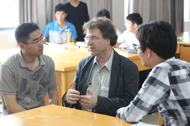 會后,諾貝爾特.拜恩哈德參加電子系答辯會,并向電子系學生詳細介紹光伏這一專業。(學生記者 張俐 羅歡)