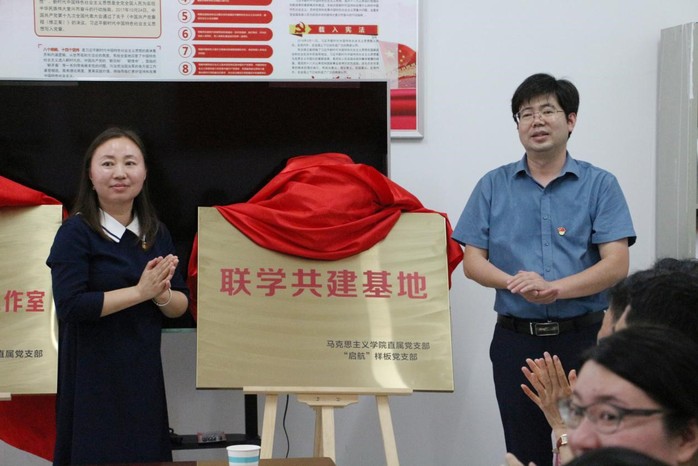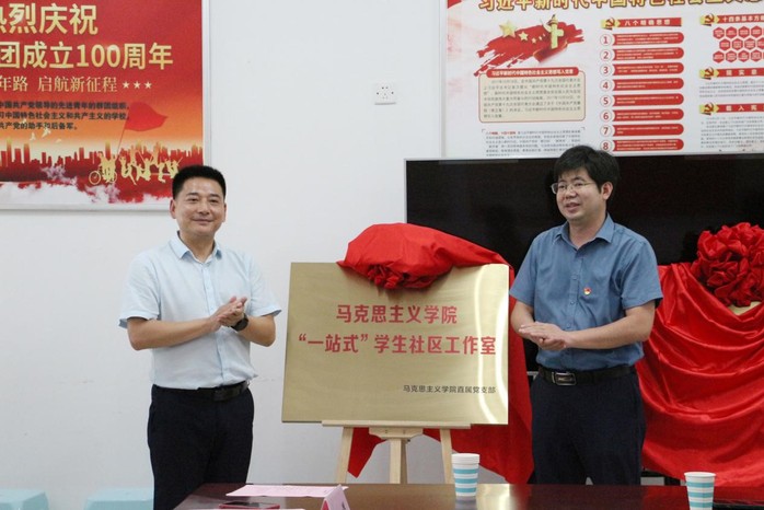 隨后,馬克思主義學院院長陳志超、杜娟和陶龍澤共同為馬克思主義學院“一站式”學生社區(qū)工作室和“聯(lián)學共建基地”揭牌。