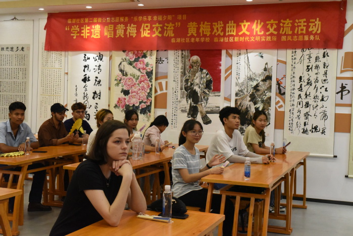 在社區工作人員的帶領下,留學生代表參觀了臨湖社區海外人員服務站,走進多個具有中國文化特色的活動室,對中國傳統文化特別是傳統節日民俗有了更深的感悟。通過體驗黃梅戲課程,留學生們了解了黃梅戲起源發展以及流派門類,并現場學習了經典曲目《天仙配》。