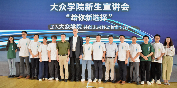會上,大眾學院院長王曉峰介紹了大眾學院的發展歷程、建設成果以及人才培養模式,并講解了大眾學院開設的“智能制造工程”“數據科學與大數據技術”及“新能源材料與器件”三個專業的學科建設情況。大眾中國學習與發展中心文化及人力資源溝通部高級總監婁屹和大眾安徽首席制造官施耐德(Mr.Schneider)分別從大眾品牌、產業基地、全價值鏈、純電產品研發、發展優勢和企業文化等多方面介紹了大眾集團中國和大眾安徽的發展情況,加深了新生對于大眾公司和品牌的了解與認識。
