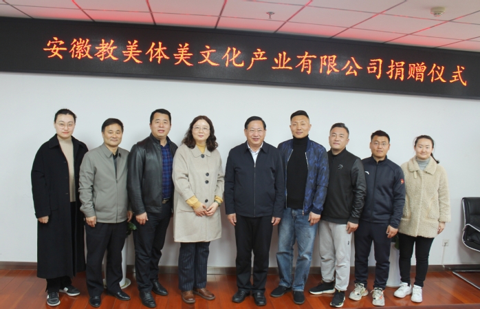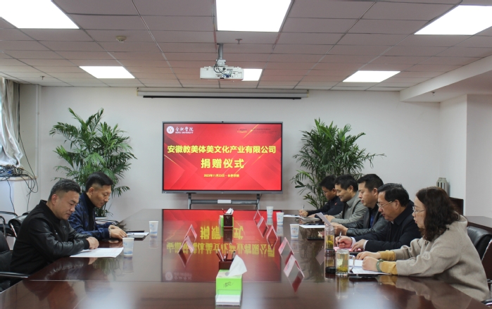 11月23日上午,安徽教美體美文化產業有限公司體育器材捐贈儀式在我校行政樓八樓會議室舉行。公司總經理彭紅偉、安徽中德教育合作基金會秘書長何世昆、公共體育與藝術教學部主任許剛等參加捐贈儀式。儀式由基金會管理辦公室主任劉金平主持。