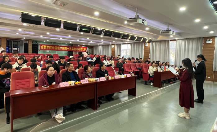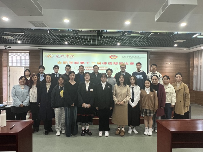11月24日下午,合肥學院第十三屆德語朗誦比賽在學校一期六棟報告廳舉行。外國語學院黨委書記吳孔寶、院長葉旭萍、安徽中德教育合作基金會秘書長何世昆、德語系主任張煒等參加。本次比賽由安徽中德教育合作基金會贊助,12名來自德語系、物流班、大陸班和信息與計算機科學班的學生同臺競技。外國語學院朱越、李菲菲、趙赫男、劉倩男四位老師擔任評委。
