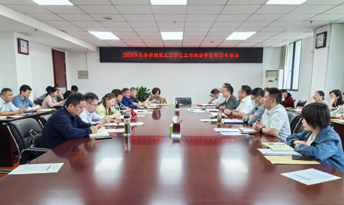 4月26日,2024年春季學期第三次學生工作例會暨反電詐專題會在行政樓八樓會議室舉行。宣傳部、保衛處、學生處、研究生處、校團委負責人,各學院黨委書記、副書記、學工辦負責人參會。會議由學生處處長丁增云主持。
