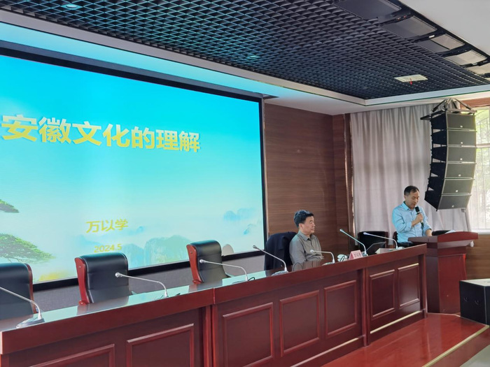 萬以學從“地理環境與文化生成”“輿地沿革與文化傳承”“時空交織與文化蝶變”“融舊鑄新與文化迭代”等方面以樸實的語言和典型事例闡述安徽文化源流和發展脈絡,并就文化傳承、文化資源挖掘及創新發展等方面與師生進行分享交流。