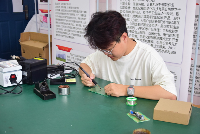 在38棟506創新實驗室,2022級電子信息工程專業學生孫曉偉正全力備戰兩大賽事:全國大學生電子設計競賽(安徽賽區)及中國國際大學生創新大賽省賽。在鐘倫鎖老師的悉心指導下,他與團隊其他14人一同打磨名為“池鳴天下——新能源電池綜合服務平臺”的項目,目前,該項目已榮獲校賽金獎,省賽計劃書也已順利提交。此外,在電設競賽上,他與兩位隊友在李翠花老師的指導下并肩作戰,自7月5日起,由李老師帶領進行三周密集培訓,旨在提升競賽實力。作為雙賽領隊,孫曉偉深感責任重大,他自我鞭策:“我將全身心投入培訓,不斷精進,直至賽事圓滿落幕。”