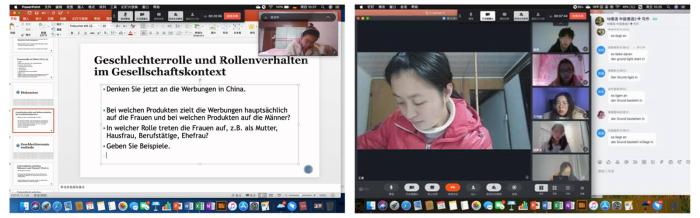 課堂上,我堅持不唱獨角戲、要做團體操的原則,積極開展線上互動,學生參與感強,課堂氛圍輕松融洽,并實時反饋和解答問題。《中級德語 2》平均每節課互動次數上百,我通過多層次輸入,從語言層面的詞句篇章的表達到內容結構與意義的講解,再到社會文化的背景結合與主題補充,提供相關音頻、視頻資源,充分調動學生課堂參與的積極性和語言產出的熱情,將問題和思考融入班級互動,依據課程難度,采取翻轉課堂的形式,組織班級結成學習小組,充分發揮學生的創造力和團隊合作能力。課后,利用騰訊會議,展開一周班會,收集學生線上學習效果反饋,及時備案與調整。