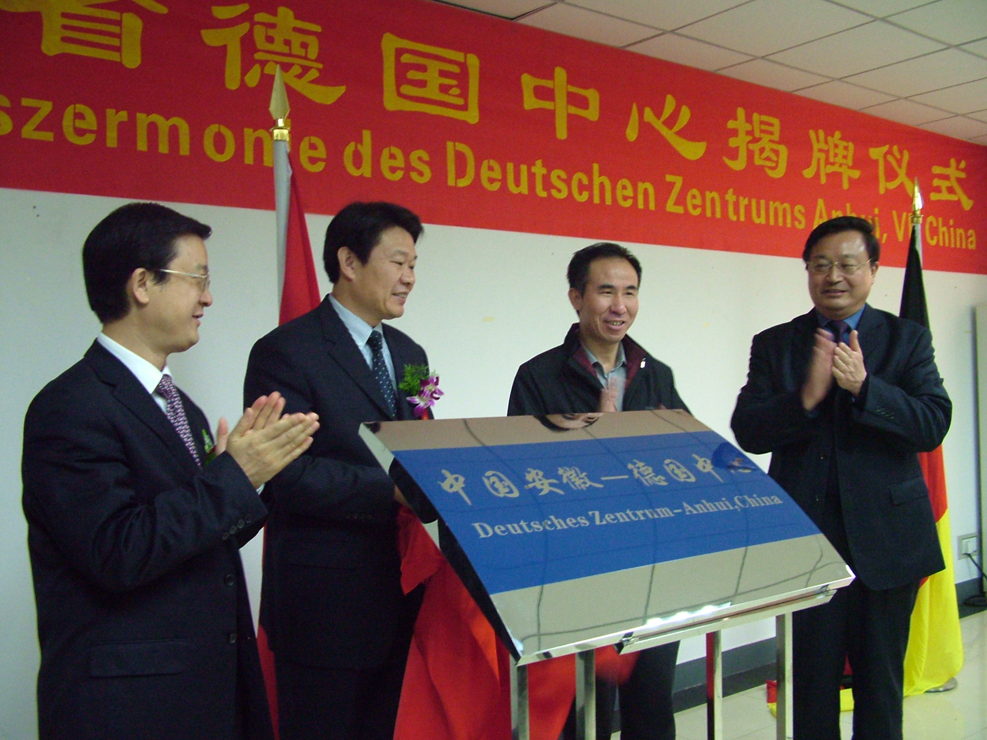 12月18日,“中國(guó)安徽―德國(guó)中心”在合肥學(xué)院成立,省外事辦公室主任李永勝(左二),省教育廳廳長(zhǎng)程藝(左三),合肥市委常委、常務(wù)副市長(zhǎng)張曉嶙(左一),合肥學(xué)院黨委書(shū)記陶登松為中心揭牌。