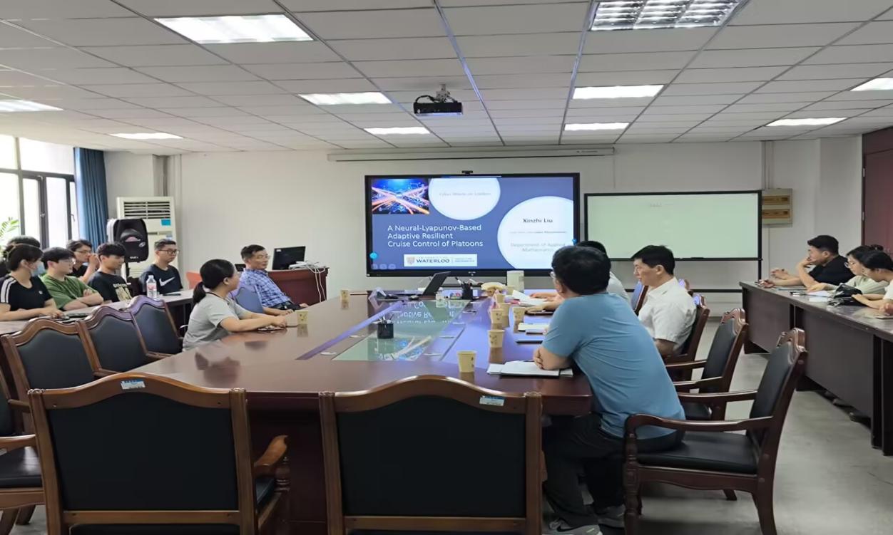 報告前,合肥大學(xué)校長任永教授親切會見劉新芝教授,對學(xué)科專業(yè)建設(shè)、人才引進等方面做了簡要交流。隨后,在37號樓3樓305會議室,劉新芝教授為我院師生作了題為“Neural-Lyapunov-Based Adaptive Resilient Cruise Control of Platoons subject to Cyber-Attacks”的學(xué)術(shù)報告,報告由人工智能與大數(shù)據(jù)學(xué)院黨委書記牛欣教授主持,科研處副處長王磊教授、數(shù)學(xué)與統(tǒng)計系和城市建設(shè)與交通學(xué)院相關(guān)專業(yè)教師與學(xué)生參加此次報告會。