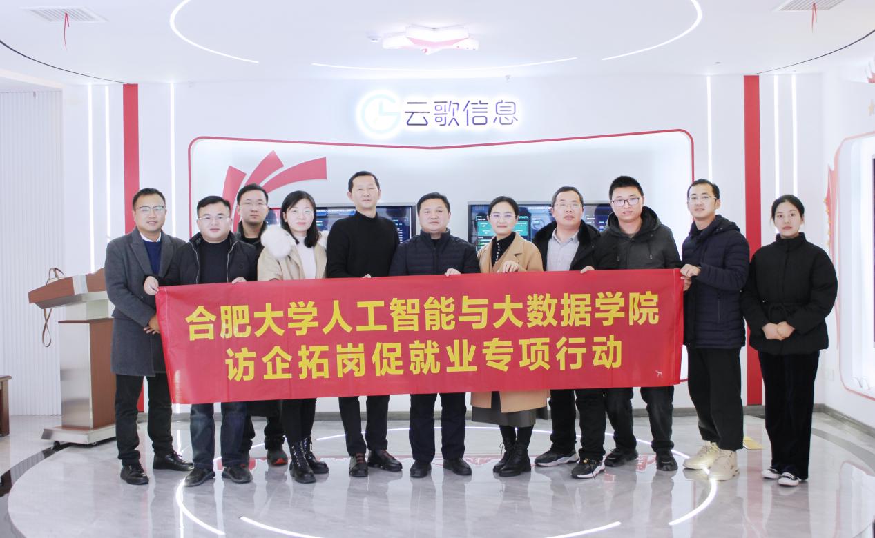 為更好地了解企業(yè)需求,拓展學生就業(yè)渠道,2024年1月17日上午,人工智能與大數據學院積極開展訪企拓崗促就業(yè)專項行動,走訪合肥云歌信息科技有限公司,此次走訪由院長余海峰帶隊,院黨委副書記姚蓓蓓、副院長陳圣兵參加,合肥云歌信息科技有限公司總經理顧云接待。