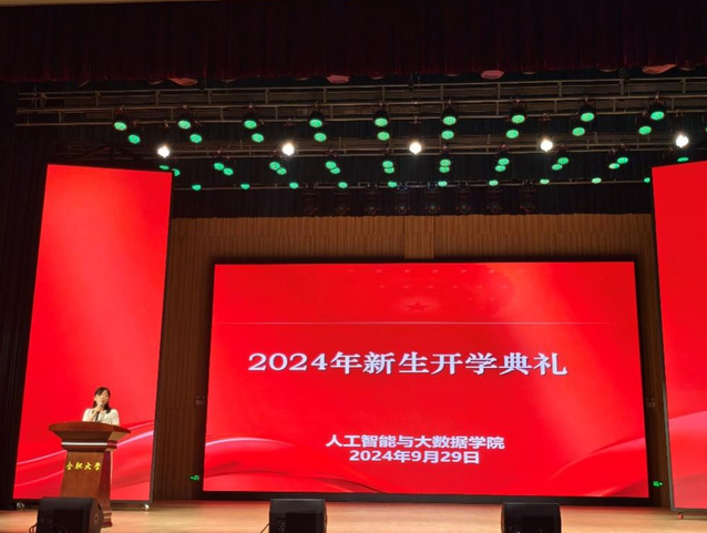 為熱烈歡迎2024級新同學,展示學院積極向上的精神風貌,9月29日下午,人工智能與大數據學院在新大學生活動中心隆重舉行2024級本科生新生開學典禮。人工智能與大數據學院黨委書記牛欣教授、院長余海峰教授、副院長陳圣兵教授、大數據與信息工程系主任屠菁老師、數學與統計系主任姚玉武老師、副主任牛勇老師、全體輔導員和2024級新生出席,本次典禮由學院黨委副書記姚蓓蓓主持。