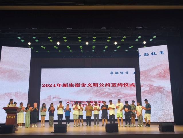 活動最后,舉行新生宿舍文明公約簽約儀式,姚蓓蓓強調,文明宿舍創建的重要性不僅體現在突出大學生的文明素質、倡導整潔衛生的環境,幫助學生形成良好的生活習慣,更是體現大學生的安全意識和自治能力,對于創造良好的校風和學風也具有重要的作用。隨后19位新生代表現場宣讀誓詞,并簽訂了《人工智能與大數據學院宿舍文明公約》。