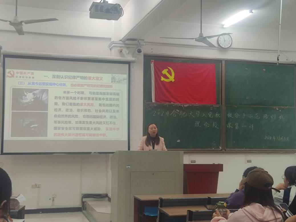 2024年11月5日晚,合肥大學2024年入黨積極分子示范培訓班理論授課第一講在38棟3JT教室舉行,本次黨課由先進制造工程學院黨委書記杜娟進行授課,共75名黨校成員參加本次課程,黨課主題是“學黨規 守黨紀 爭做新時代好青年”。
