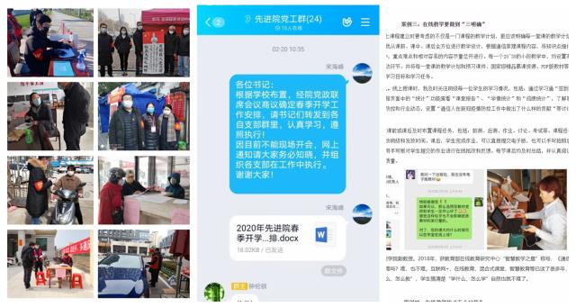 在疫情防控中,學院黨員領導干部靠前指揮,全體黨政干部堅守崗位,每日隨訪學生情況,并加強宣傳引導,堅定師生打贏疫情防控阻擊戰的信心決心。對湖北地區和與湖北有過接觸的學生,由院領導、輔導員一對一重點聯系,及時掌握情況,及時指導幫助。在抓好疫情防控工作的同時,充分運用QQ群、微信群等信息化工具,召開線上會議,對各項工作進行了具體部署:包括開學后疫情防控、黨建、線上教學、產學研、教科研、碩士點申報、研究生招生、人才引進、學生等各項工作,保證了“停開學不停工作”,促進了各項工作的穩步推進。