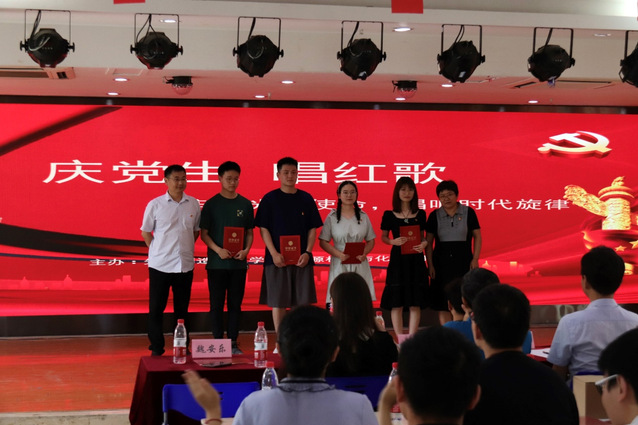 七位選手全部演唱結束后,由鐘倫鎖老師上臺致感謝詞,現場觀眾為選手們進行線上投票。在投票的同時,由校黨委巡查辦主任丁增云對產賽選手進行點評,丁增云老師就各位選手不同的音色、音調、演唱方式做出了自己的評價,他表示整場活動就是一場和諧的、享受的音樂會,唱出了對黨的擁護和對未來的憧憬,希望全體成員能夠不忘初心跟黨走,不斷進步。點評結束后,主持人宣布獲獎名單:羅靖同學獲得一等獎,毛清欣、丁柔兩位同學獲得二等獎,王鵬程、楊雙剛、王春燕、吳倩四位同學獲得三等獎。在場嘉賓為獲獎選手頒發獲獎證書并合影留念。