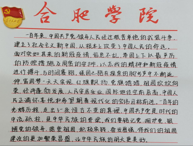 一名在場學生黨員在此歡欣鼓舞的時刻,也書寫出了自己感想“……一百年的光輝歷程,走出了一條亙古不變的真理,中國共產黨是時代的中流砥柱,是中華門民族的脊梁。我們要銘記黨、擁護黨、跟隨黨的領導,熱愛祖國,積極實踐,奮發圖強,將我們的祖國建設的更加繁榮昌盛,讓中華民族的明天更美好!”